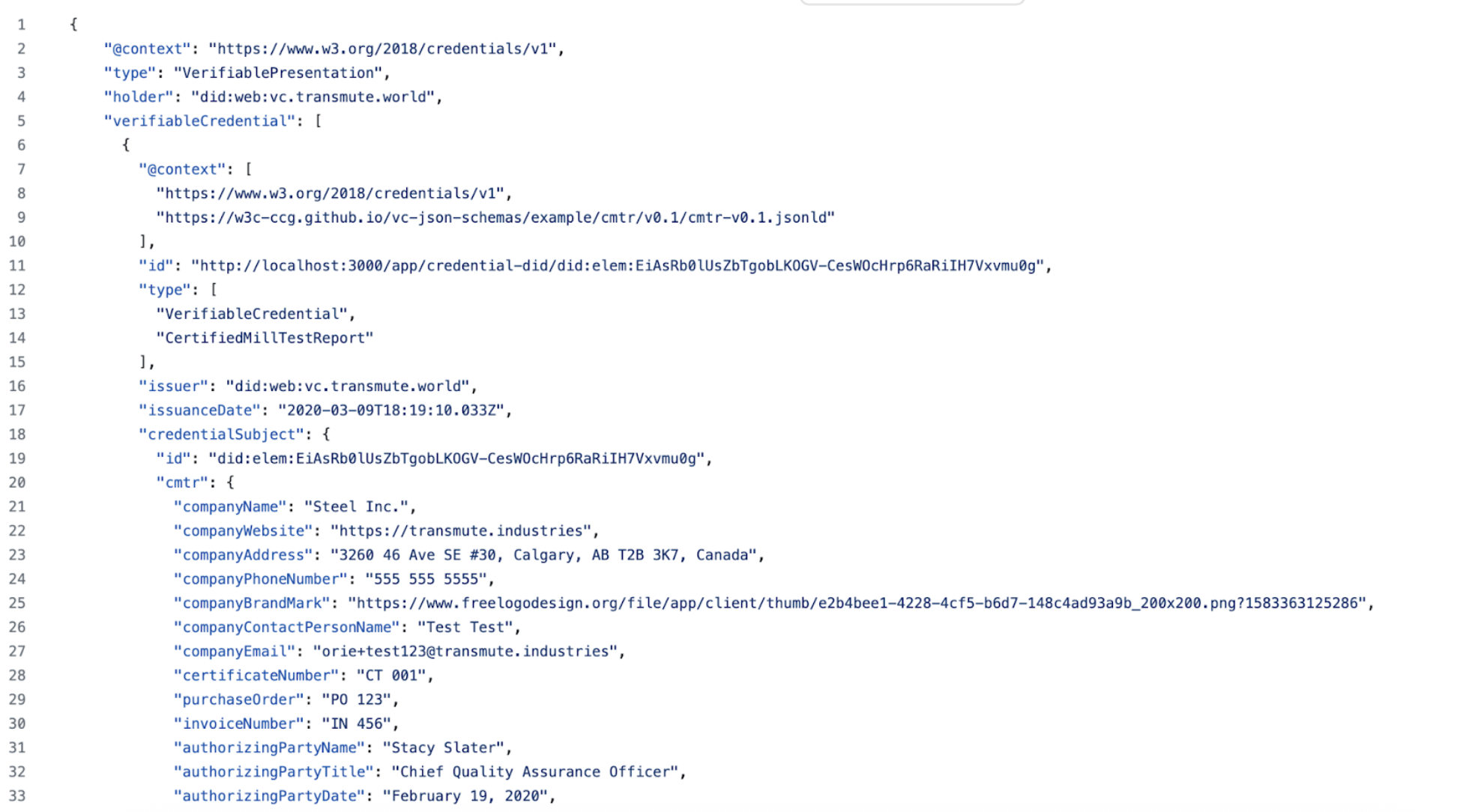 Abridged Verifiable Presentation Example: ![]() Figure 2: Abridged Verifiable Presentation Example Full example can be found in the associated file named “example-verifiable-presentation-v0.1.json” |